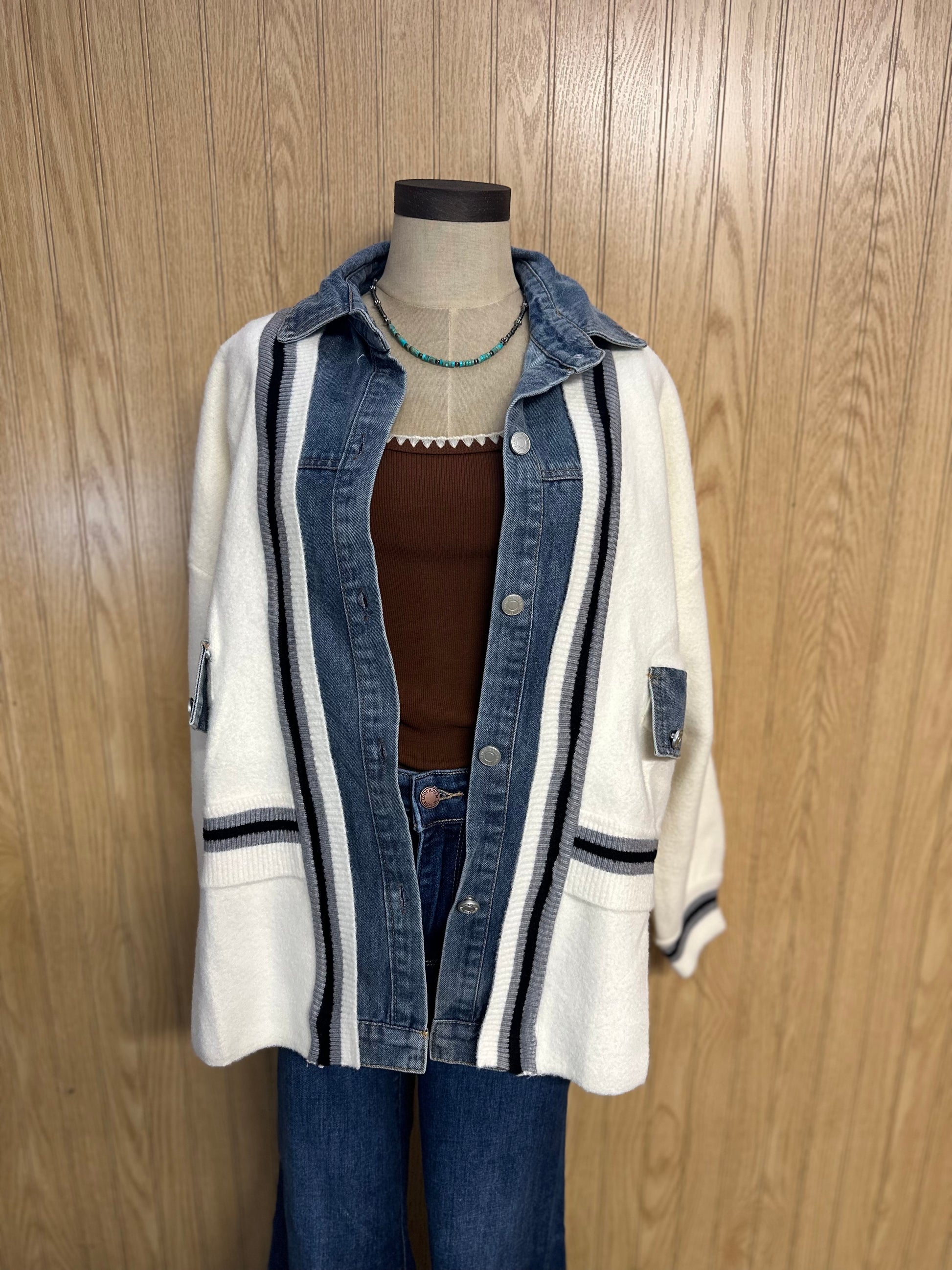BUTTONS STRIPED ACCENTS DENIM POCKETS OVERSIZED CARDIGAN 55%POLYESTER 25%NYLON 20%COTTON *Solid, Denim *Button Down *Denim Pockets *Layered Look *Casual, Cardigan Actual product color may vary from the images shown. Every monitor or mobile display has a different capability to display colors, and every individual may see these colors differently.