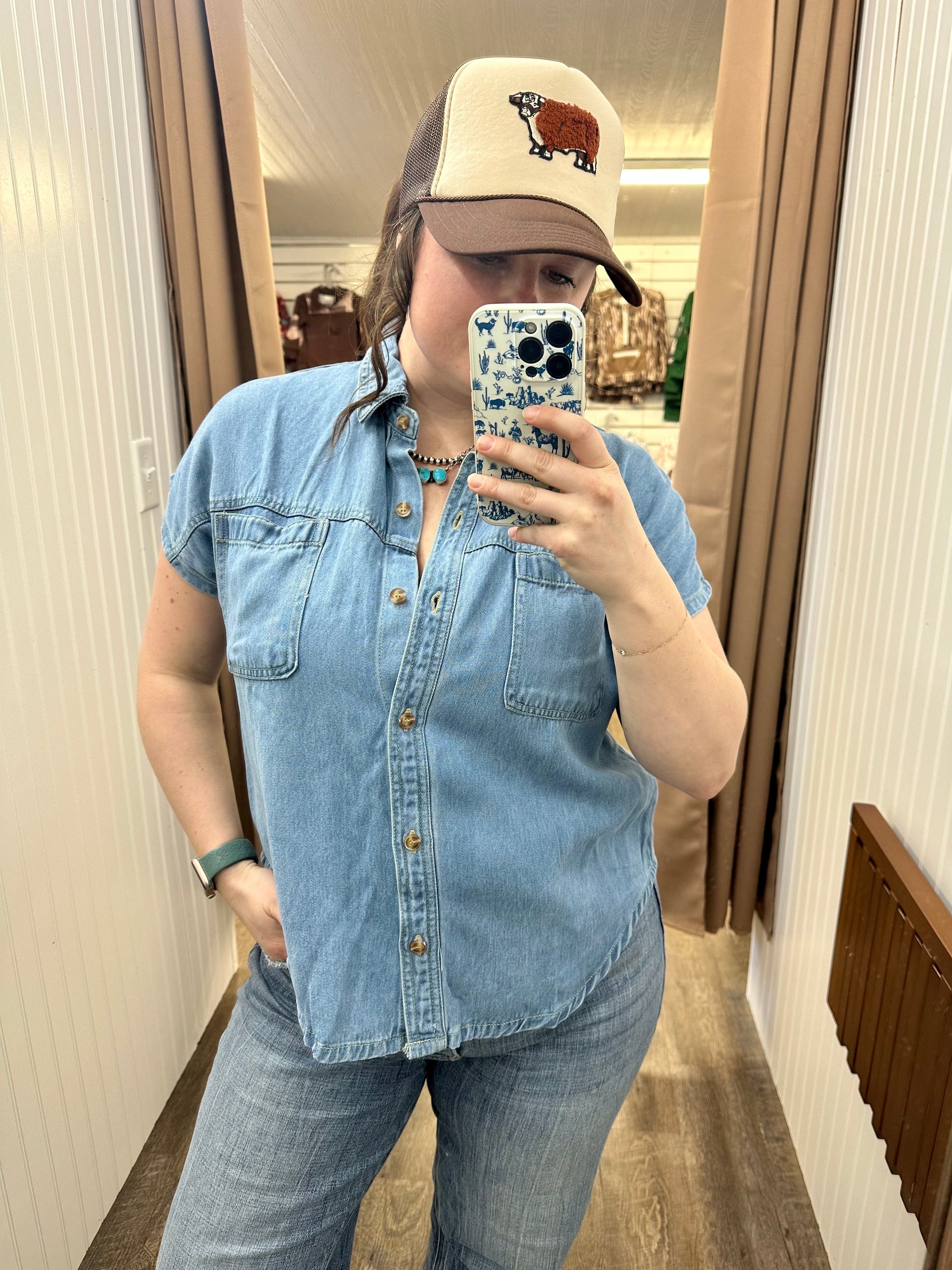 SHORT SLEEVE BUTTON DOWN DENIM SHIRT