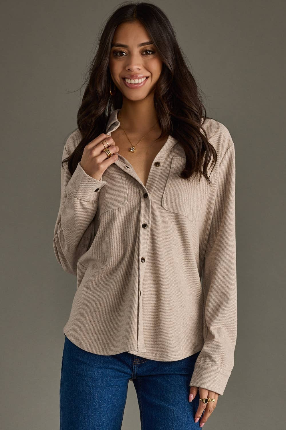 Wrap yourself in comfort with this Tan Button Up, designed to move with you thanks to its soft, stretchy fabric. Perfect for layering or wearing solo, it brings easy style and cozy vibes to your everyday look. Whether you're lounging or out and about, this shirt keeps things comfy and playful all day long.