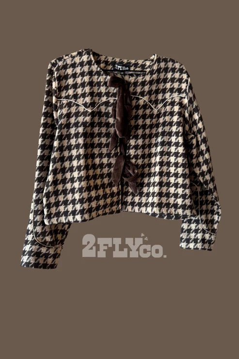 Turn heads in The Checkpoint Top — where classic print meets western flair. The bold houndstooth pattern gives timeless sophistication, while the suede tie-front detail and subtle piping add a touch of rustic charm. Its cropped fit makes it perfect for pairing with high-waisted jeans, skirts, or leather shorts. Whether you’re headed out on the town or to a fall market, this top strikes the perfect balance between polished and playful.