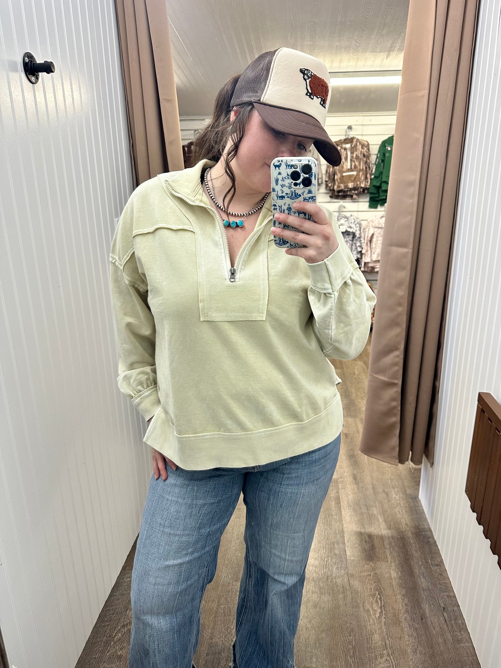 WASHED HALF ZIP RIBBED DETAIL LONG SLEEVE KNIT TOP